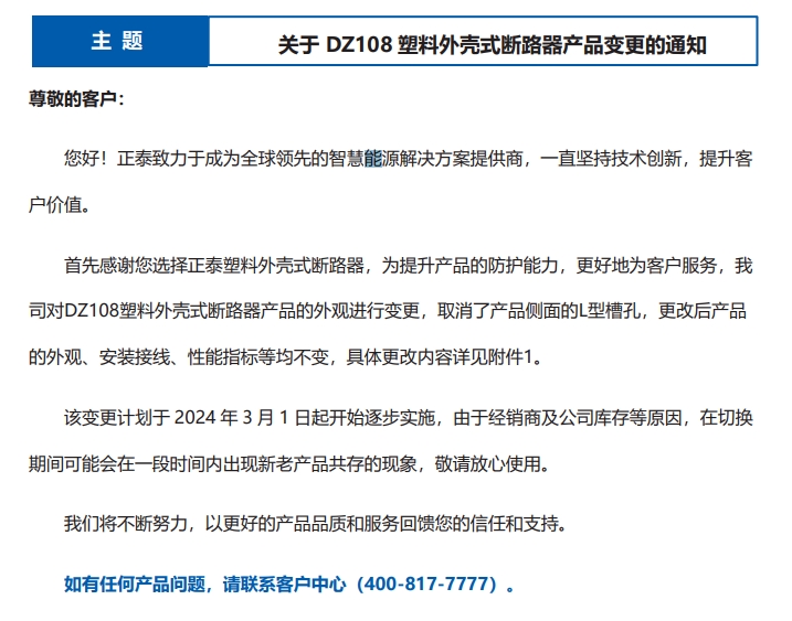 關(guān)于 DZ108 塑料外殼式斷路器產(chǎn)品變更的通知
