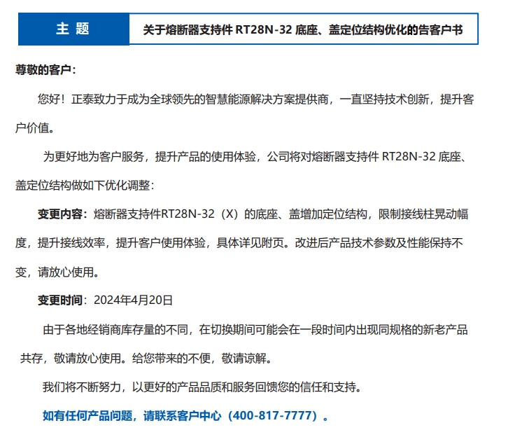 關(guān)于熔斷器支持件 RT28N-32 底座、蓋定位結(jié)構(gòu)優(yōu)化的告客戶書