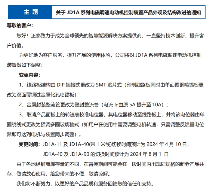 關(guān)于 JD1A 系列電磁調(diào)速電動機控制裝置產(chǎn)品外觀及結(jié)構(gòu)改進的通知