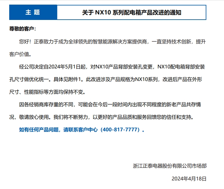 關(guān)于 NX10 系列配電箱產(chǎn)品改進的通知