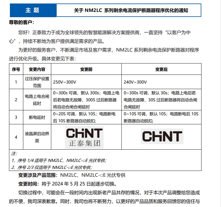 關(guān)于 NM2LC 系列剩余電流保護(hù)斷路器程序優(yōu)化的通知