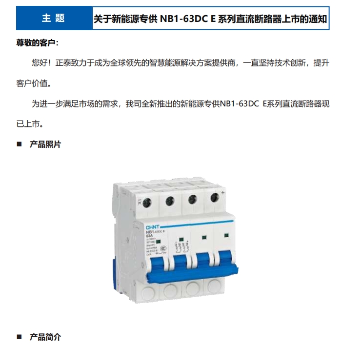 關于新能源專供 NB1-63DC E 系列直流斷路器上市的通知