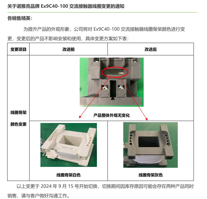 關(guān)于諾雅克品牌Ex9C40-100交流接觸器線圈變更的通知