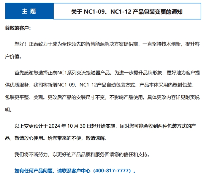 關(guān)于 NC1-09、NC1-12 產(chǎn)品包裝變更的通知