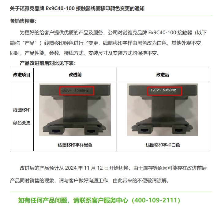 關(guān)于諾雅克品牌 Ex9C40-100 接觸器線圈移印顏色變更的通知
