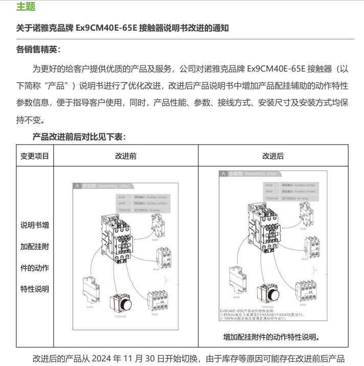 關于諾雅克品牌 Ex9CM40E-65E 接觸器說明書改進的通知