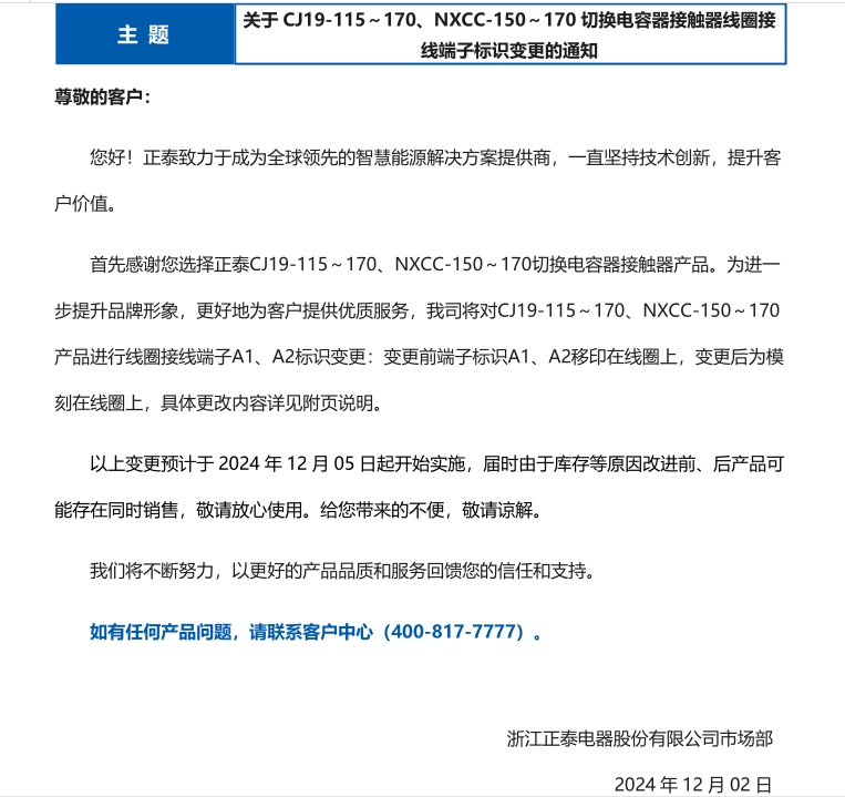 關(guān)于 CJ19-115~170、NXCC-150~170 切換電容器接觸器線圈接 線端子標(biāo)識變更的通知