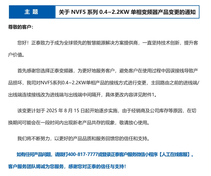 關(guān)于 NVF5 系列 0.4~2.2KW 單相變頻器產(chǎn)品變更的通知