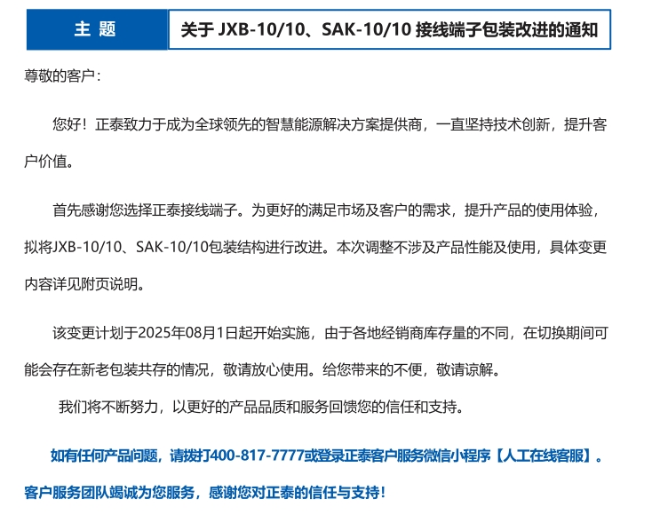 關于 JXB-10/10、SAK-10/10 接線端子包裝改進的通知