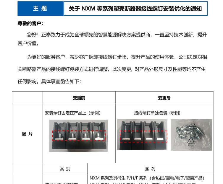 關于 NXM 等系列塑殼斷路器接線螺釘安裝優(yōu)化的通知