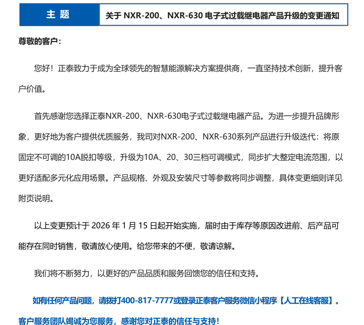關(guān)于 NXR-200、NXR-630 電子式過載繼電器產(chǎn)品升級(jí)的變更通知