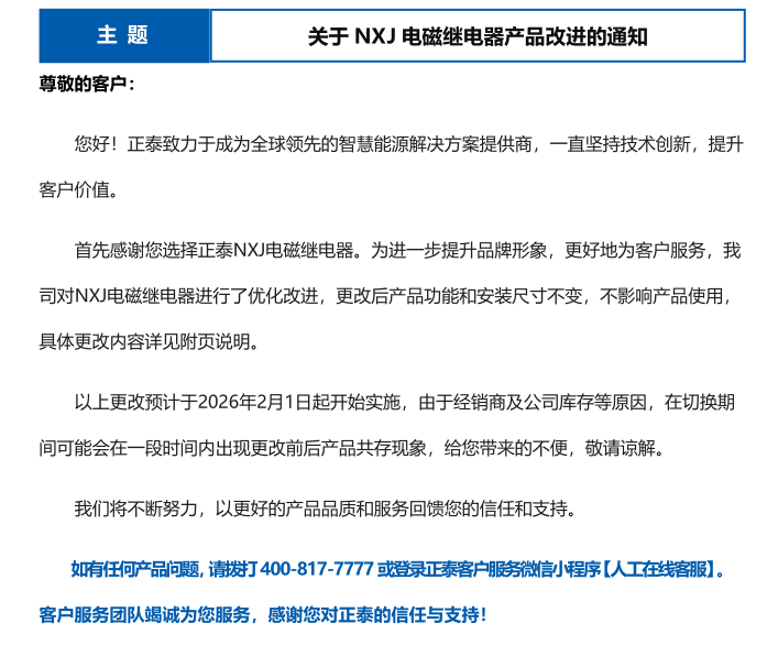 關(guān)于 NXJ 電磁繼電器產(chǎn)品改進(jìn)的通知