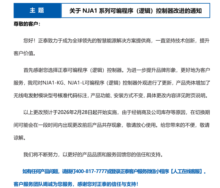 關于 NJA1 系列可編程序(邏輯)控制器改進的通知