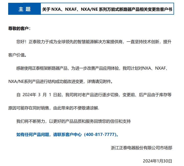 關(guān)于 NXA、NXAF、NXA/NE 系列萬能式斷路器產(chǎn)品相關(guān)變更告客戶書