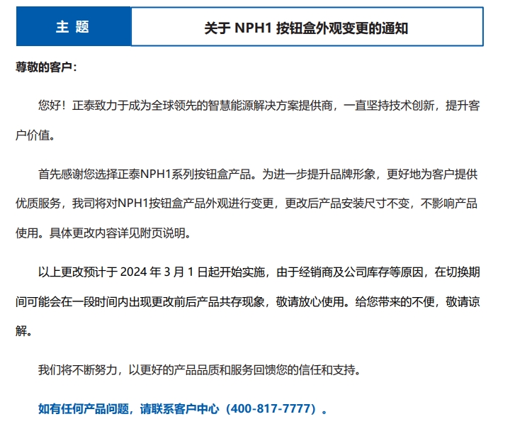 關(guān)于 NPH1 按鈕盒外觀變更的通知