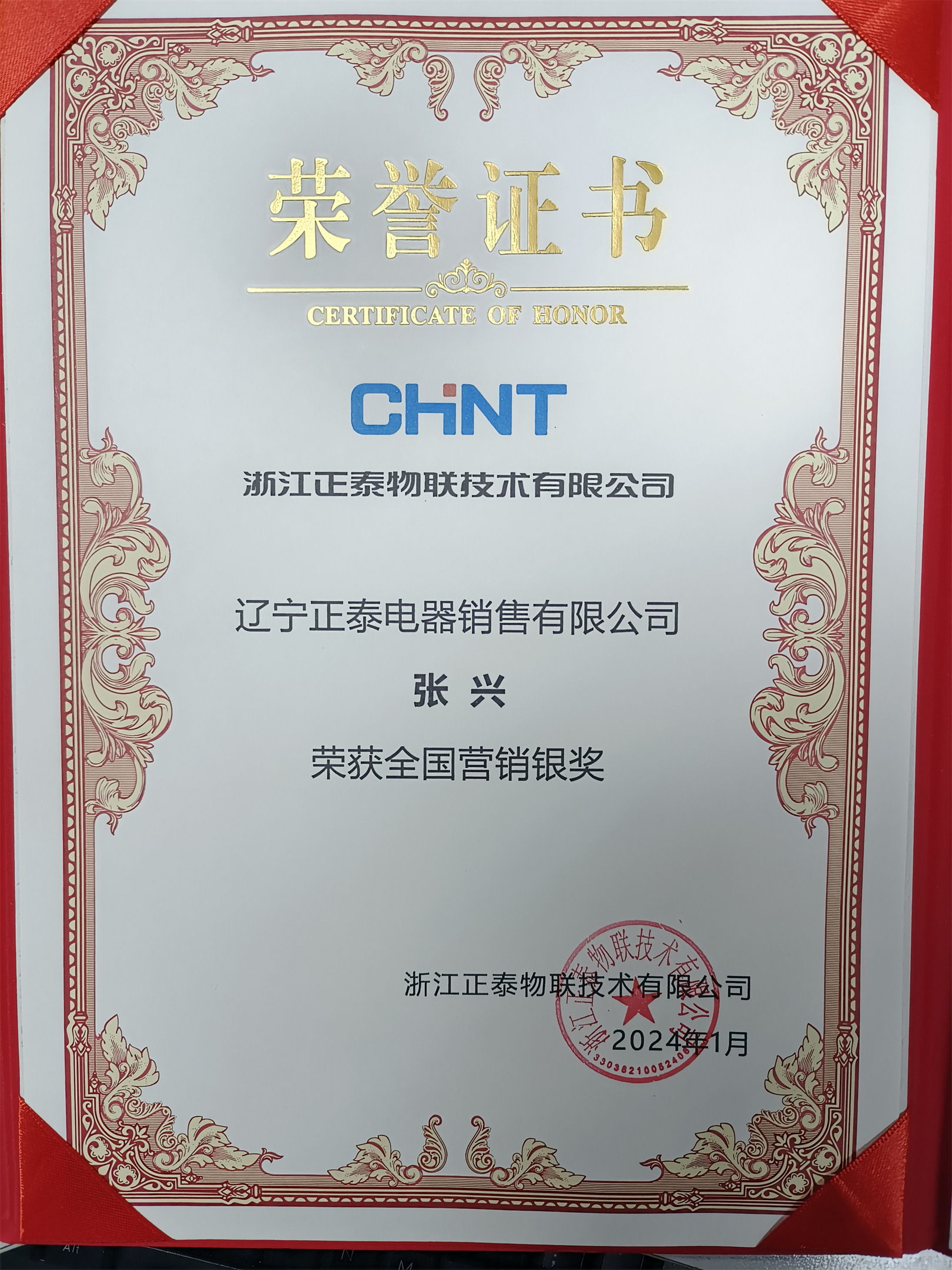 榮獲浙江正泰物聯(lián)技術(shù)有限公司全國(guó)營(yíng)銷銀獎(jiǎng)