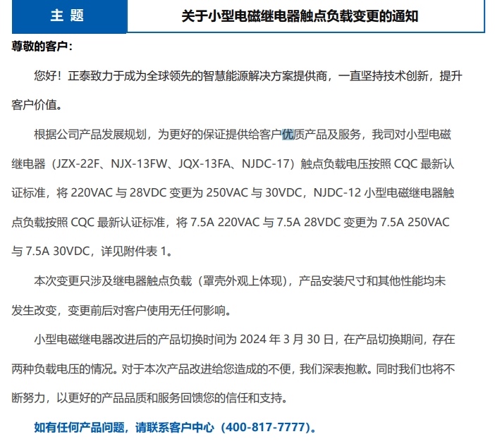 關(guān)于小型電磁繼電器觸點(diǎn)負(fù)載變更的通知