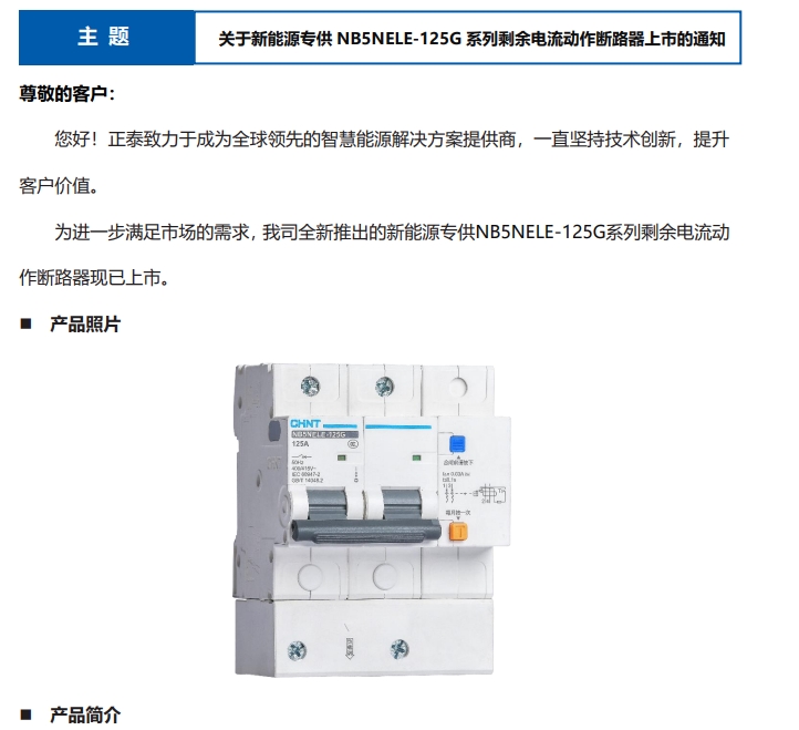 關(guān)于新能源專供 NB5NELE-125G 系列剩余電流動作斷路器上市的通知