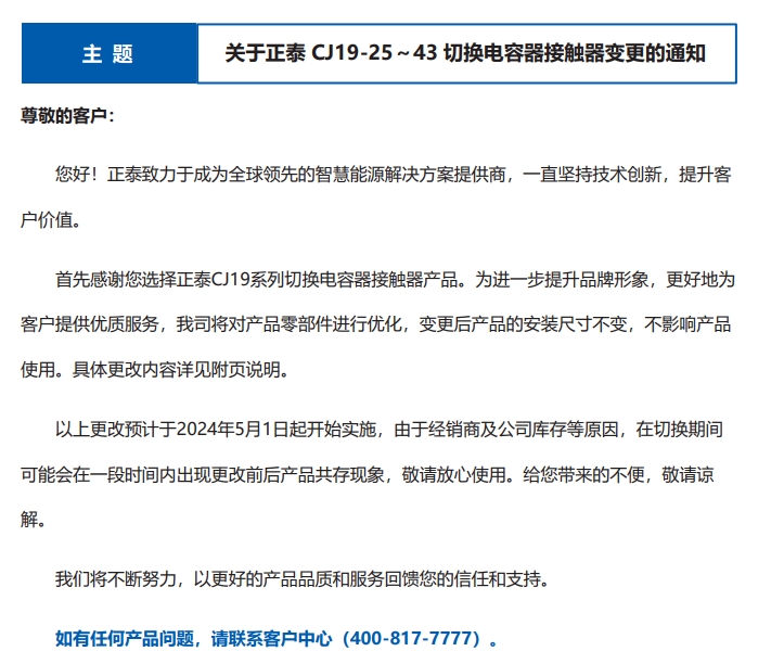 關(guān)于正泰 CJ19-25~43 切換電容器接觸器變更的通知