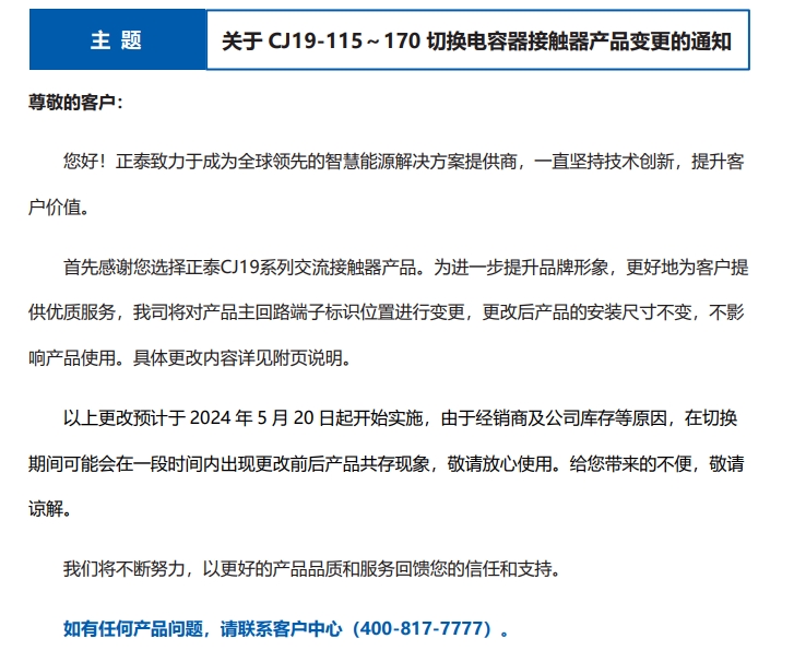 關(guān)于 CJ19-115~170 切換電容器接觸器產(chǎn)品變更的通知