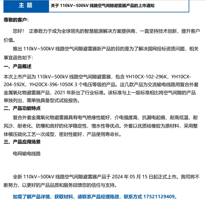 關(guān)于 110kV~500kV 線路空氣間隙避雷器產(chǎn)品的上市通知