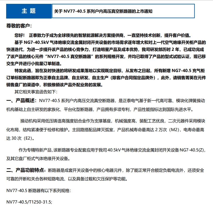 關(guān)于 NV77-40.5 系列戶內(nèi)高壓真空斷路器的上市通知