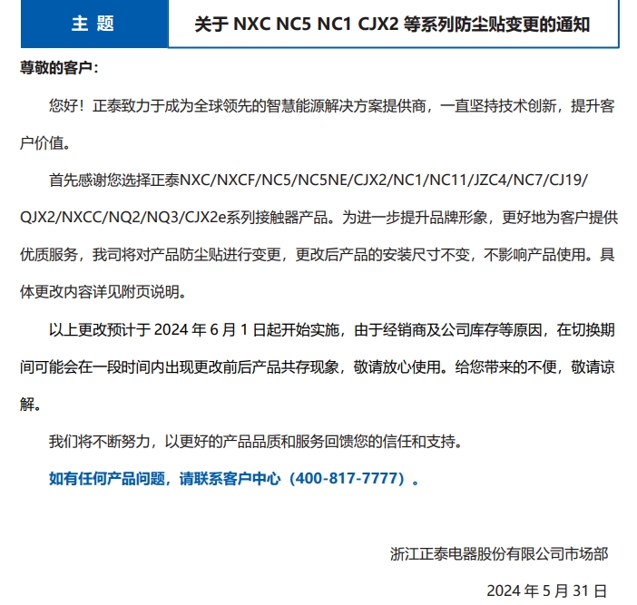 關(guān)于 NXC NC5 NC1 CJX2 等系列防塵貼變更的通知
