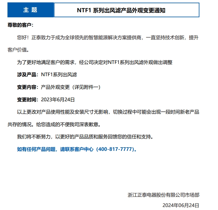 NTF1 系列出風濾產(chǎn)品外觀變更通知