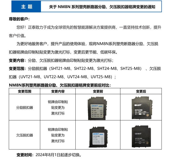 關(guān)于NM8N系列塑殼斷路器分勵、欠壓脫扣器銘牌變更的通知