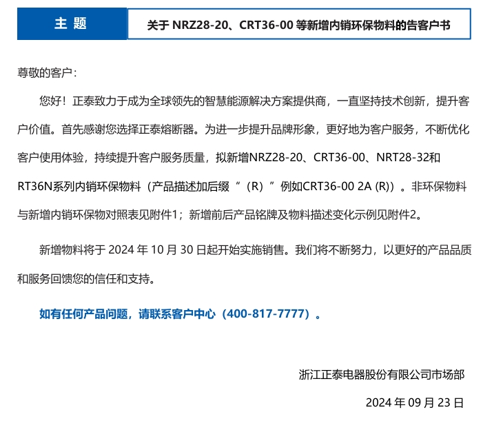 關(guān)于NRZ28-20、CRT36-00等新增內(nèi)銷環(huán)保物料的告客戶書