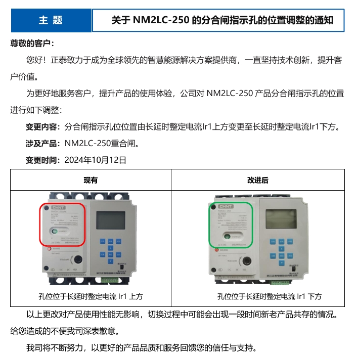 關(guān)于NM2LC-250的分合閘指示孔的位置調(diào)整的通知