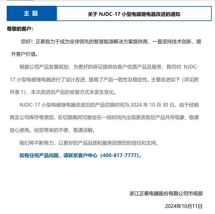 關(guān)于NJDC-17小型電磁繼電器改進(jìn)的通知
