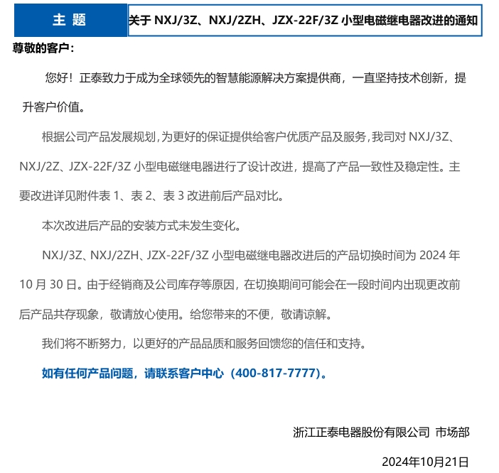 關(guān)于NXJ/3Z、NXJ/2ZH、JZX-22F/3Z小型電磁繼電器改進的通知