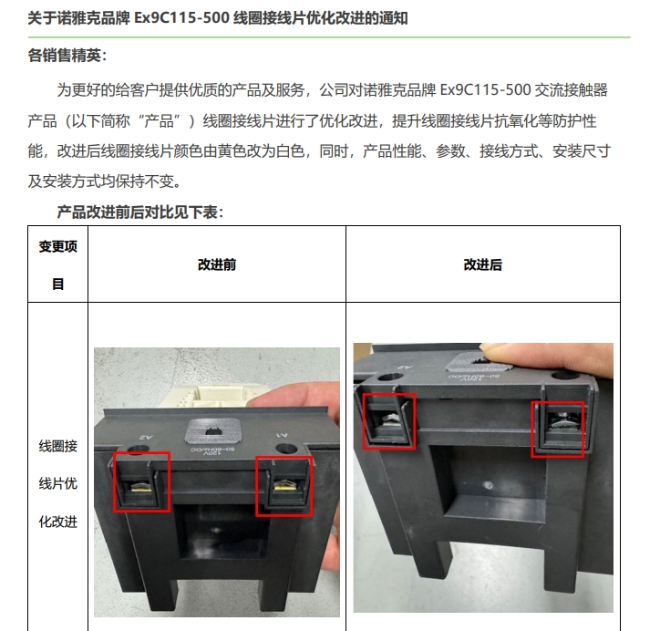 關(guān)于諾雅克品牌 Ex9C115-500 線圈接線片優(yōu)化改進(jìn)的通知