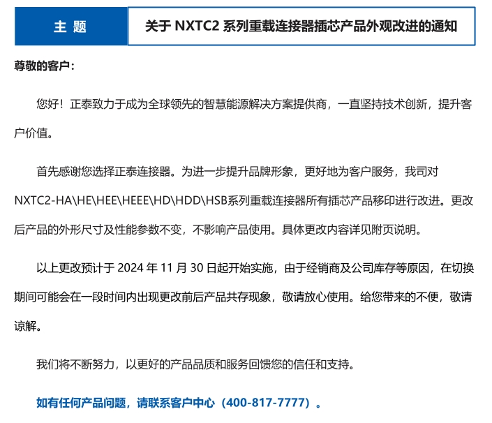關于 NXTC2 系列重載連接器插芯產(chǎn)品外觀改進的通知