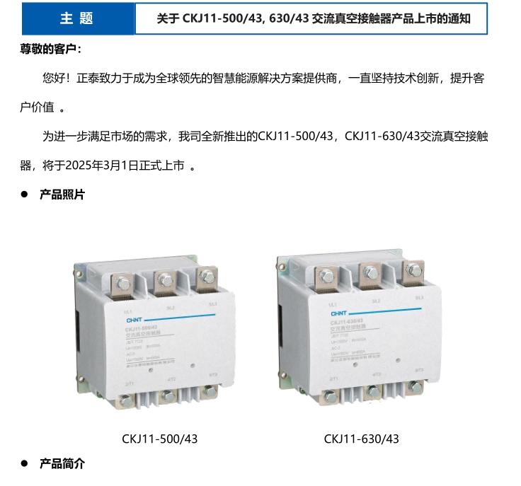 關于 CKJ11-500/43, 630/43 交流真空接觸器產(chǎn)品上市的通知