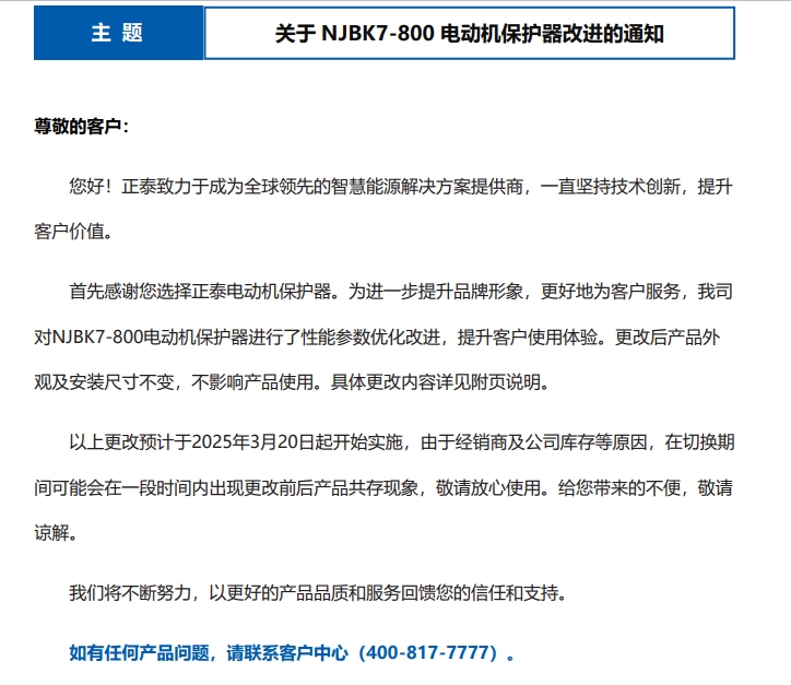 關(guān)于 NJBK7-800 電動機保護器改進的通知