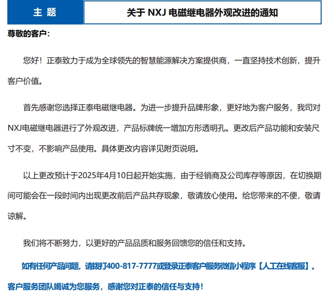 關(guān)于 NXJ 電磁繼電器外觀改進的通知