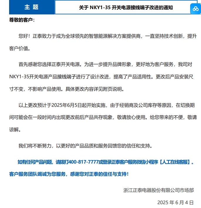 關(guān)于 NKY1-35 開關(guān)電源接線端子改進(jìn)的通知