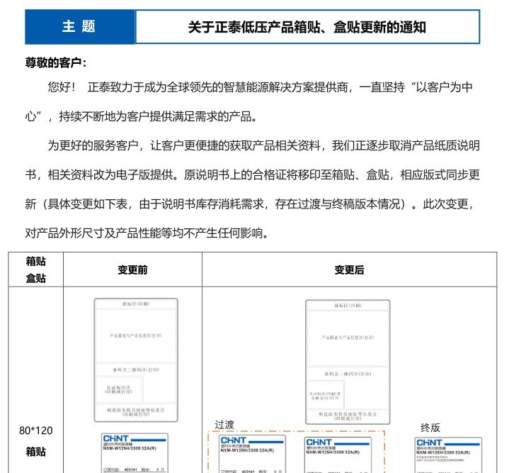 關于正泰低壓產品箱貼、盒貼更新的通知