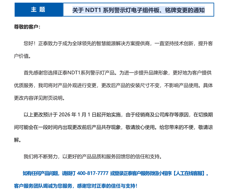 關(guān)于 NDT1 系列警示燈電子組件板、銘牌變更的通知