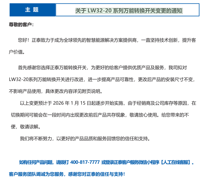 關(guān)于 LW32-20 系列萬能轉(zhuǎn)換開關(guān)變更的通知